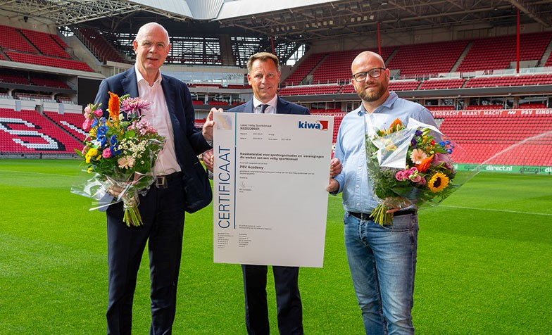 Photo: Michael van der Vlies (Kiwa) presented the Safe Sport Climate label to Toon Gerbrands (PSV) and Rick van Rooij (PSV).