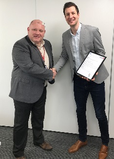 Kiwa Watertec's Business Manager David Jay was delighted to present Matt Isted NPD Programme Manager of Kohler Mira UK with a TMV certificate of approval for Kohler Mira's Mira Minilite range of TMVs.