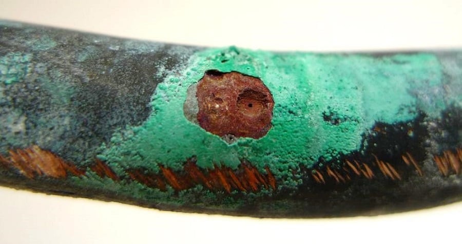 Figuur 2: Typerend schadebeeld in een doorsnede, bestaande uit een corrosieput die is bedekt met corrosieproduct waarbij een 'geperforeerd membraan' van afwijkend corrosieproduct de corrosieput afsluit. In dit geval had de corrosie op de onderzochte locatie nog niet tot perforatie geleid.
